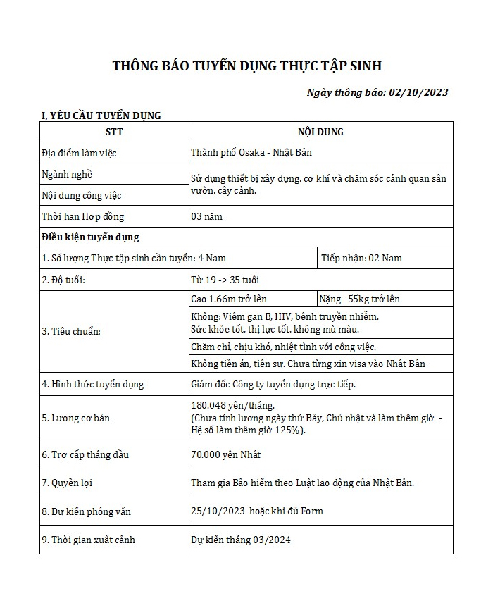 TUYỂN TTS SỬ DỤNG THIẾT BỊ XÂY DỰNG, CƠ KHÍ VÀ CHĂM SÓC CẢNH QUAN SÂN VƯỜN CÂY CẢNH